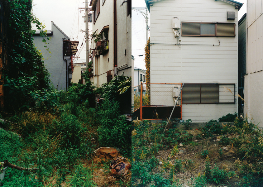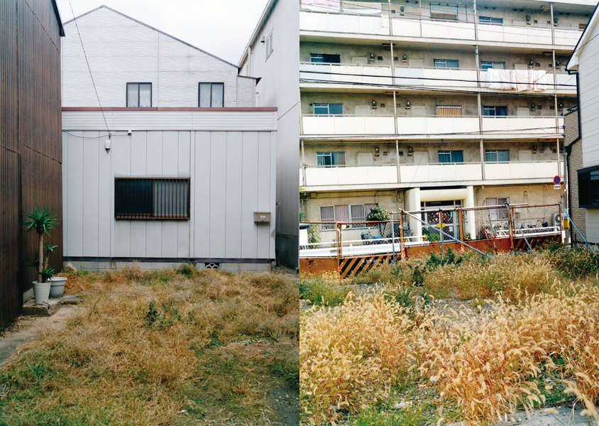 「建物に見つめられて立ち往生、と思いきや建物が主役ではないことはすぐに分かる。その手前の空間、空き地。何もないと言ってしまいそうだが、草ぼうぼうだったりゴミが捨ててあったり、隣との敷地が不分明で越境していたり、よくある光景だがよく分からない理由や諦念が垣間見える隙間。整然と並べられながら距離感は微妙に異なり、一瞬粗暴な気配が過るもむしろ知的な顔さえ見せる写真は、足並みの揃わない小波のような不協和音に満ちていてしばし離れがたい。」